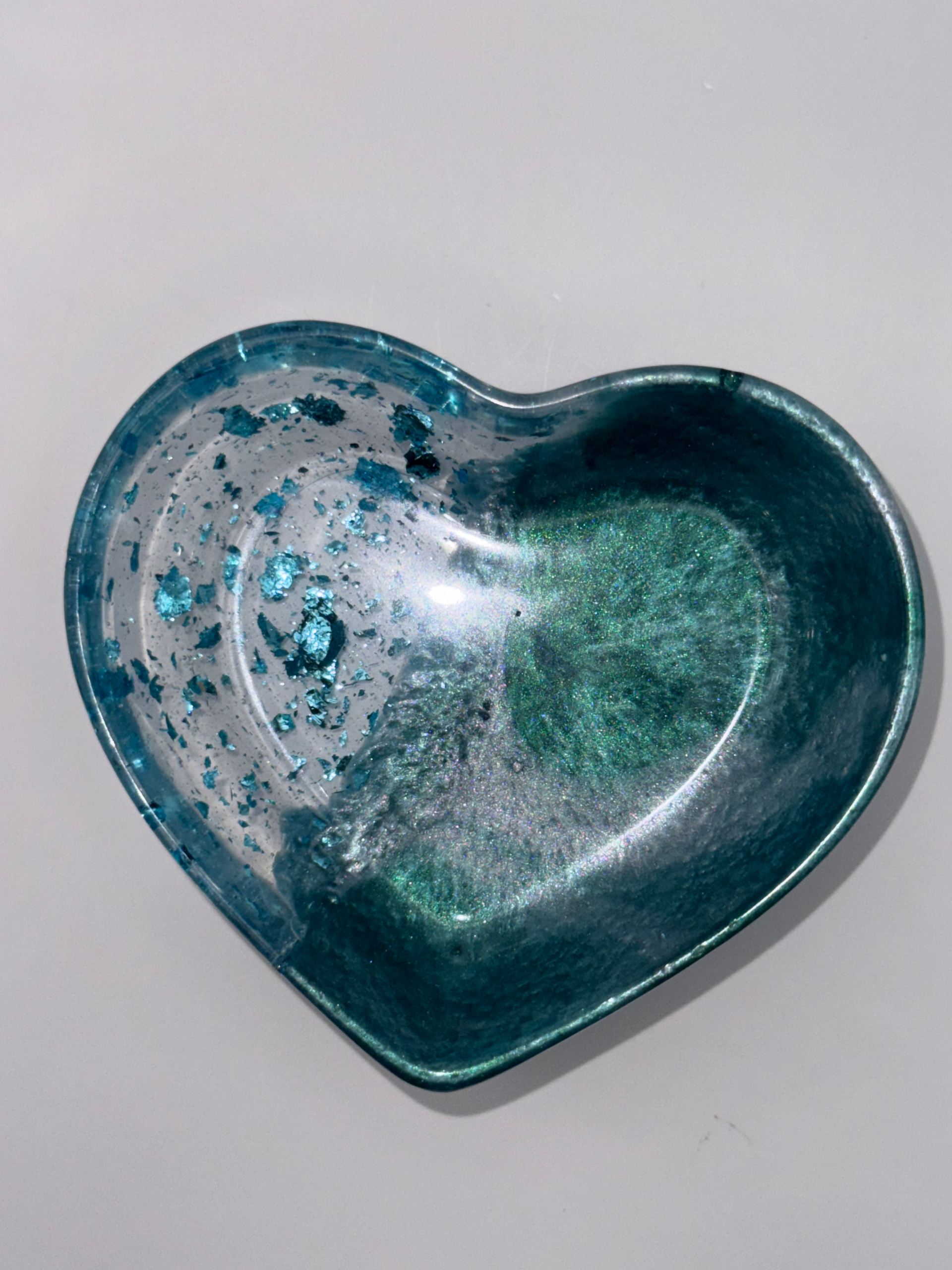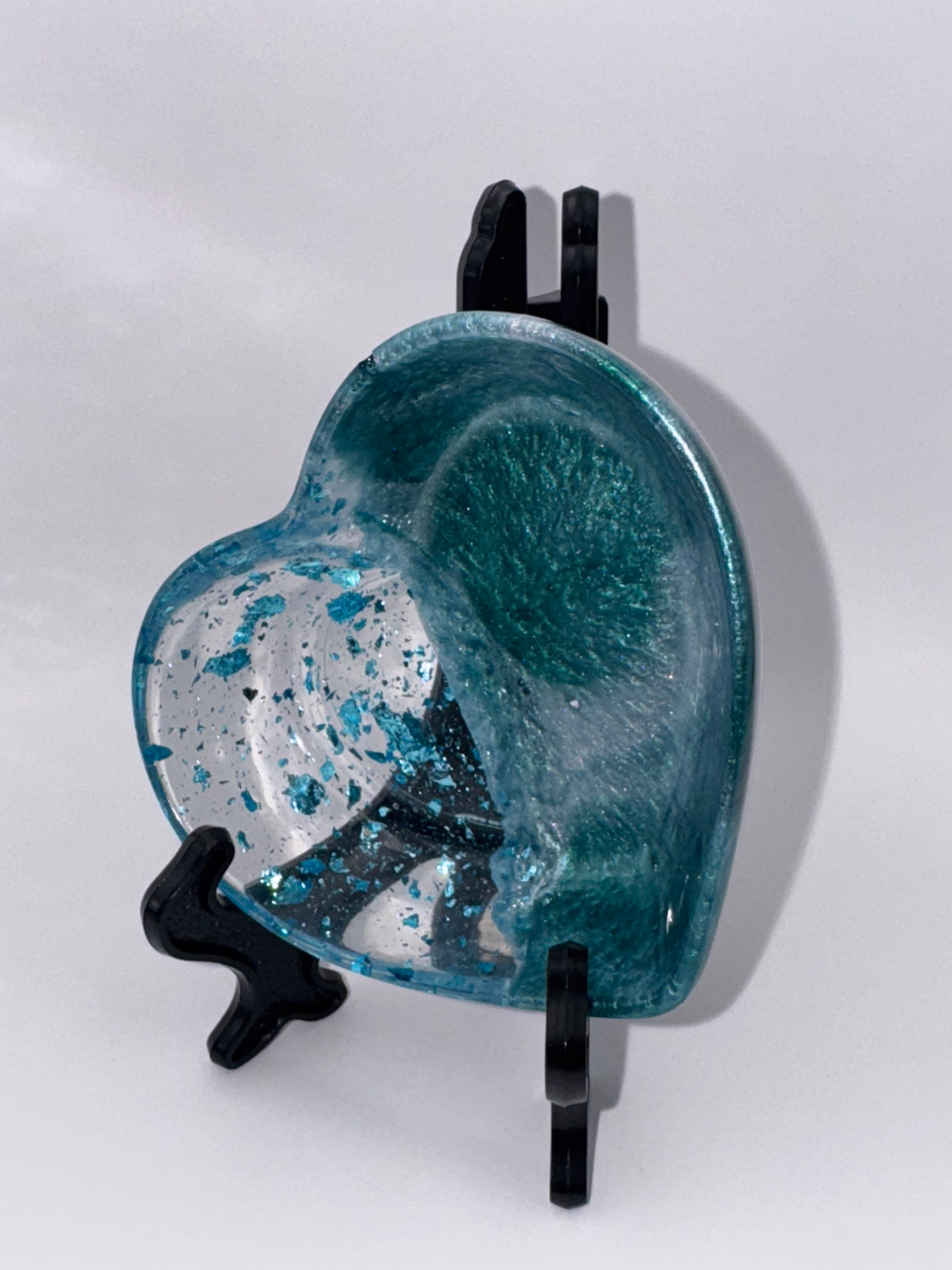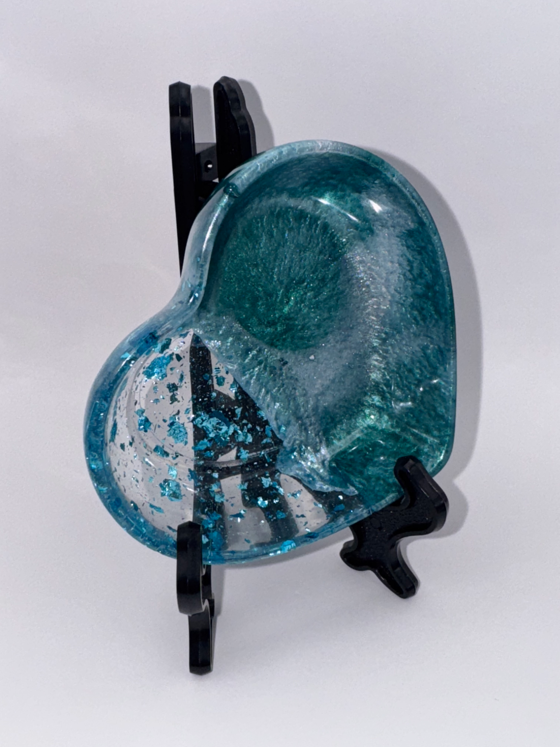 Add a gentle pop of color with EpoxyBin’s Small Turquoise Marble Light Blue Flake Heart Trinket Tray. A handcrafted epoxy tray perfect for jewelry, keys and décor.