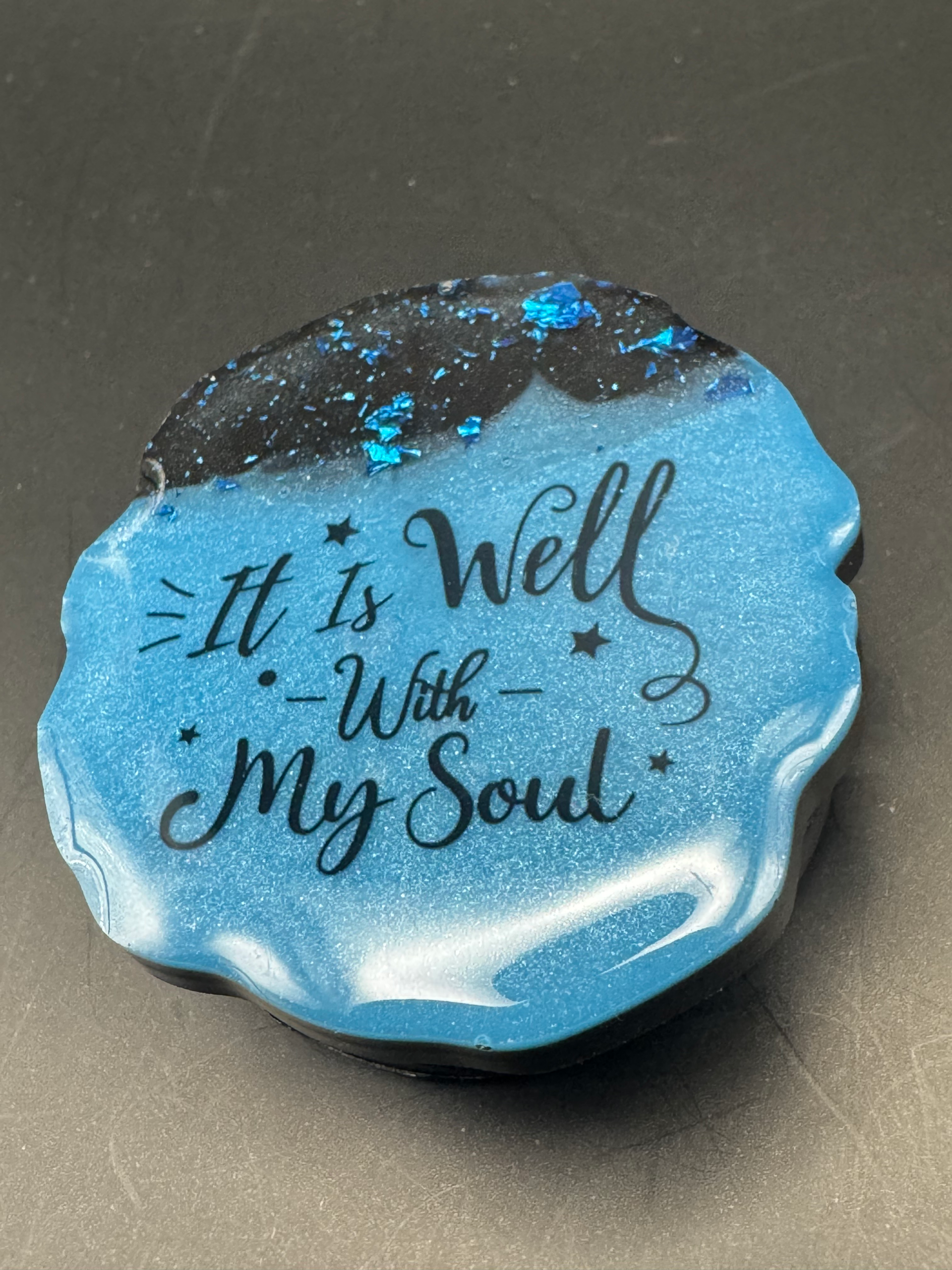 EpoxyBin’s Geode 5 Blue w/ Blue Flakes ‘It Is Well With My Soul’ Pop Socket features tranquil blue shimmer and a message of peace for everyday encouragement.