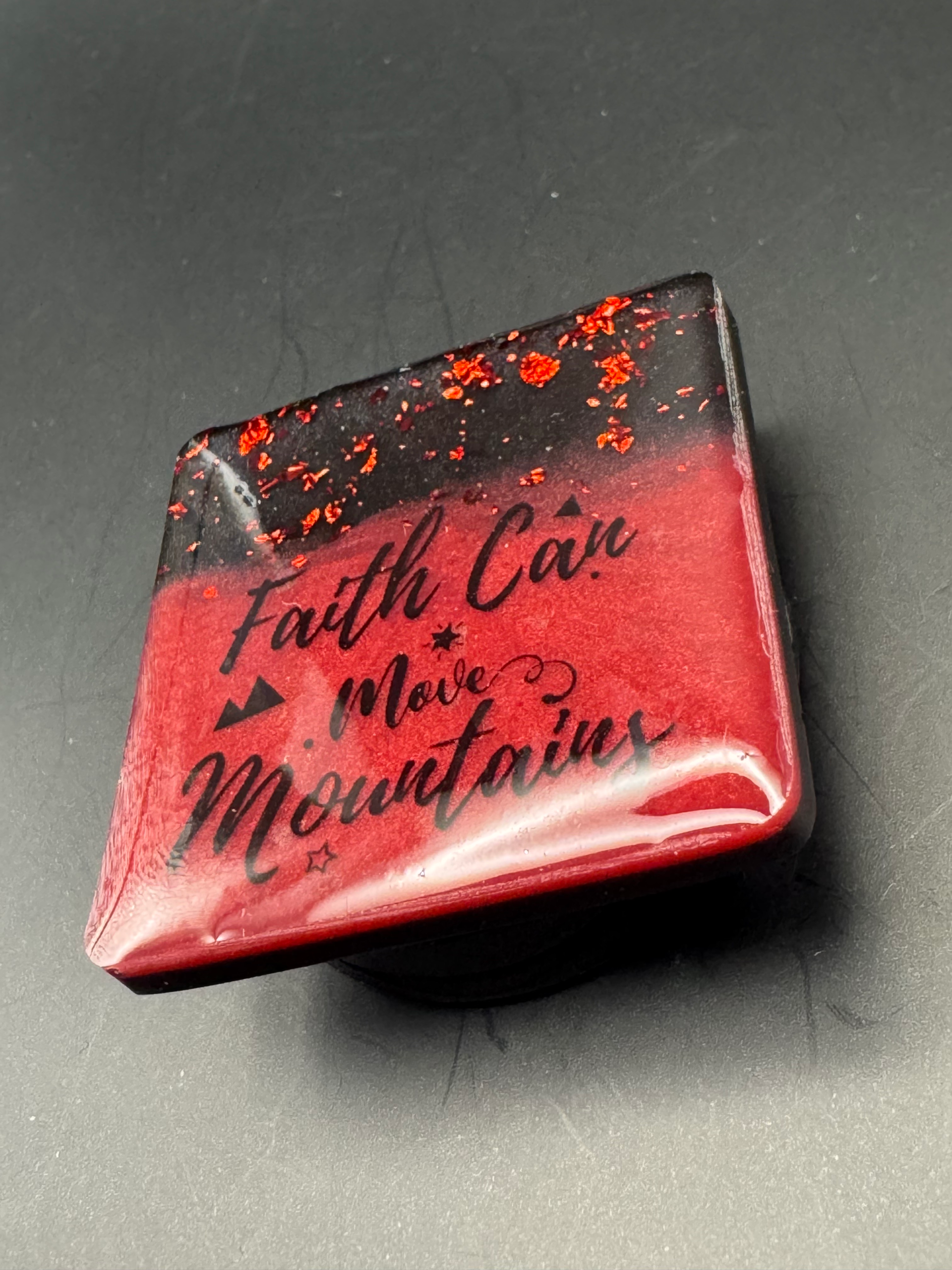 EpoxyBin’s Square Dark Red w/ Red Flakes ‘Faith Can Move Mountains’ Pop Socket pairs bold red shimmer with an inspiring message for everyday motivation
